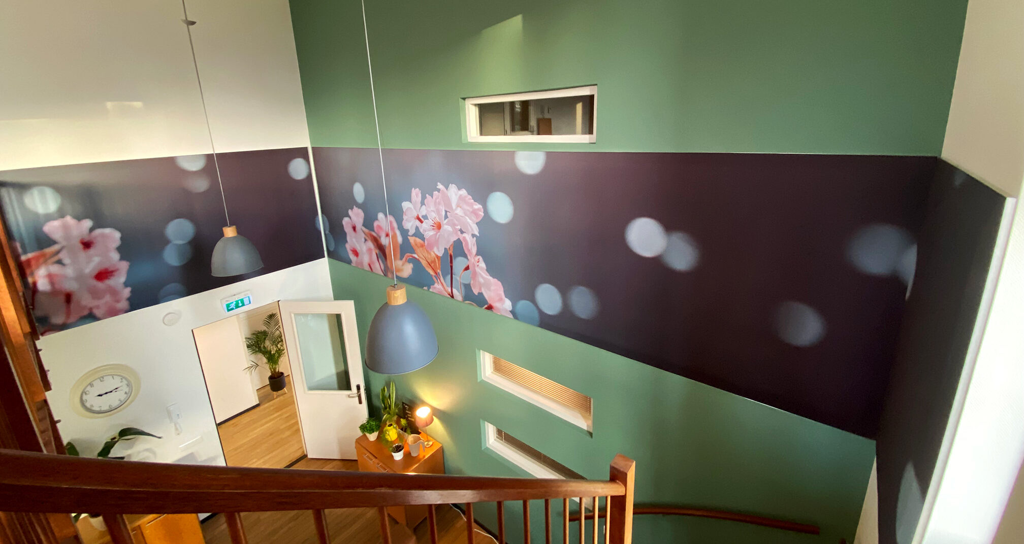 We brachten onze Acoustiwall wandbekleding aan op strategische plekken op hoogte. Het resultaat? Een stijlvolle oplossing die geluid dempt, rust brengt én aansluit bij het interieur. De woonbegeleiders van Riwis kozen zelf het beeld en de kleurstelling; helemaal in de sfeer van de locatie.